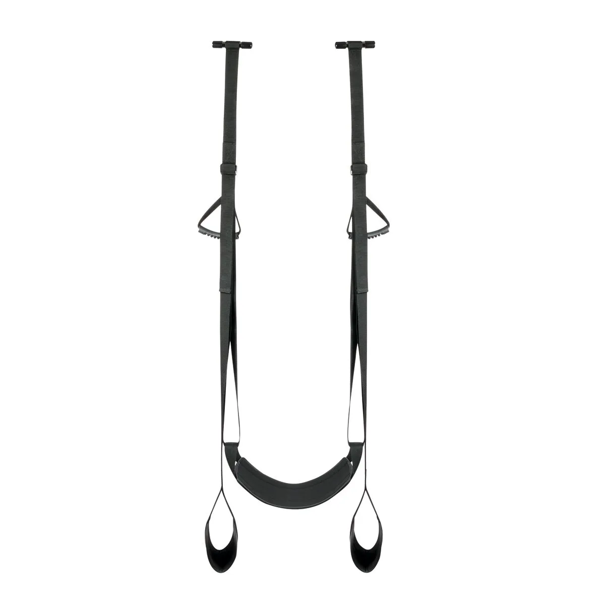 Haz que tu vida sexual se active con este excitante soporte sexual para la puerta. El soporte puede utilizarse en cualquier parte. Lo único que necesitas es una puerta resistente que pueda soportar el peso. Simplemente coloca las barras sobre la parte superior de la puerta y ciérrala. Siéntate en el asiento, coloca las piernas dentro de los nudos y sostiene las agarraderas por encima de tu cabeza. Ya estás listo par una experiencia sexual única junto a tu pareja. Las correas pueden regularse fácilmente para conseguir un ajuste perfecto. El soporte puede sostener un peso máximo de 150 kg.