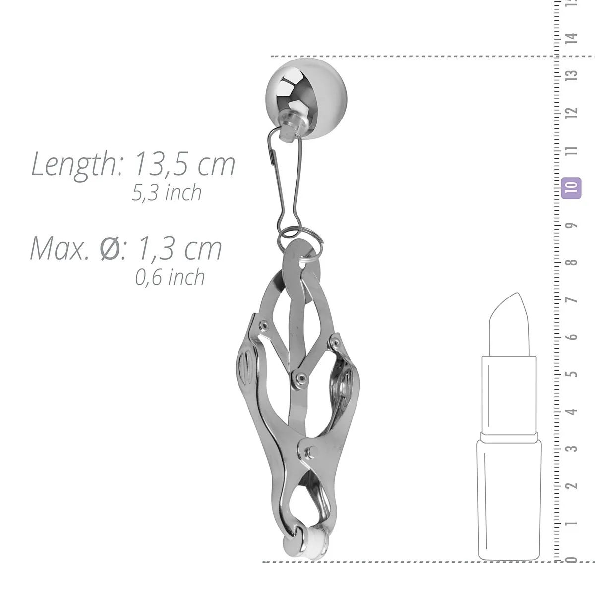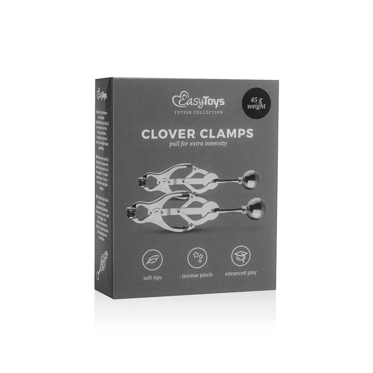 Estas hermosas pinzas de pezón de metal de la colección EasyToys están listas para estimular sus puntos más sensibles. Las pinzas de trébol japonesas están hechas de metal resistente y duradero y tienen tapas de protección suaves en las puntas. Las pequeñas bolas en la parte inferior pesan 44 gramos cada una y tiran de las pinzas para una sensación estimulante. Esto hace que las pinzas para pezones sean indispensables en la colección de todos los entusiastas de la esclavitud.