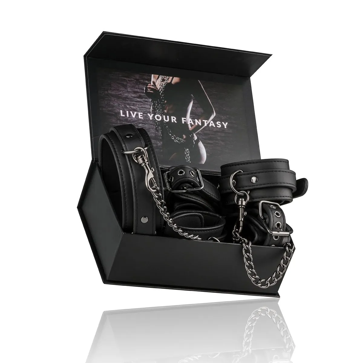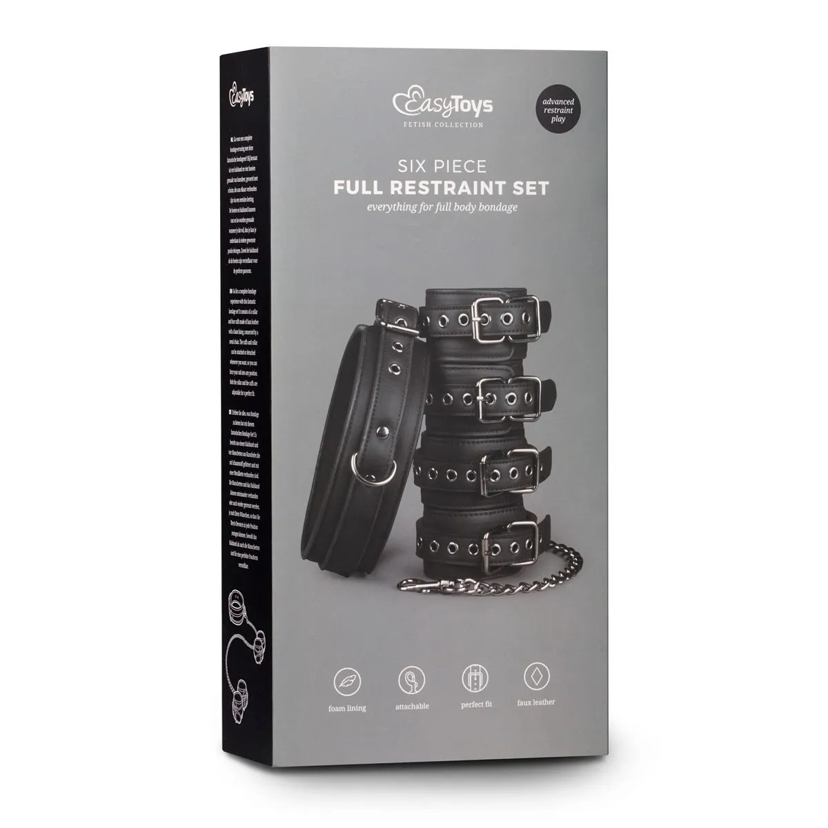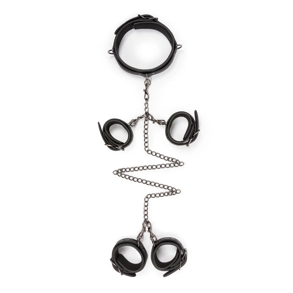 ¡Con este excelente conjunto de bondage, las posibilidades son infinitas! Se compone de un collar y esposas para muñecas y tobillos que se pueden separar fácilmente unos de otros con los cierres de clip. Los juguetes están hechos de piel sintética resistente forrada con espuma, lo que los hace más duraderos y cómodos de usar. El collar se puede ajustar de 45 a 58 cm, las esposas para muñecas de 11 a 28 cm y las esposas para tobillos de 13 a 30 cm. Utiliza este conjunto particular en combinación con otros excitantes juguetes, tales como mordazas de bola, palas y pinzas para pezones para una obtener una experiencia más excitante.