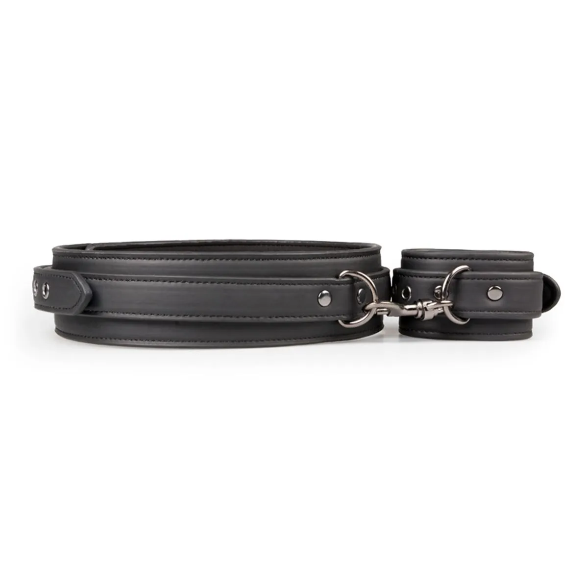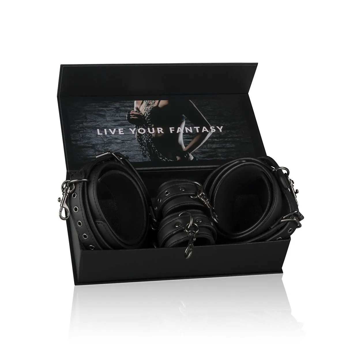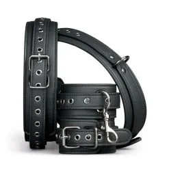 Con este set especial de esposas para muslos y muñecas, puedes atar las manos de tu pareja a sus muslos. De esta forma, tienes el control total para disfrutar de una experiencia de BDSM. Las esposas están hechas con resistente cuero de imitación y están forradas con gomaespuma para evitar rasguños. Las esposas para las muñecas están adheridas a las esposas para los muslos con clips. Por esta razón, podrás separarlas y usarlas en forma independiente o junto con otros juguetes de BDSM. Las cuatro esposas pueden regularse fácilmente para un ajuste perfecto y para ser utilizadas con total comodidad.