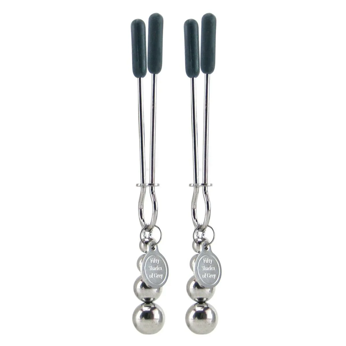 Tomado de la colección oficial Fifty Shades of Grey: pinzas para pezones con un peso de bolas de graduación de 9 gramos. Puedes ajustar la intensidad de la presión. Material: metal.