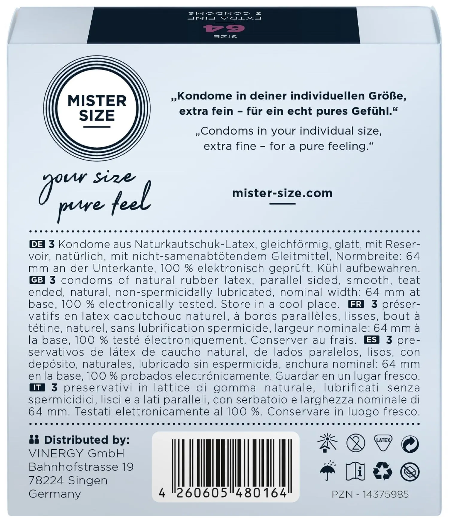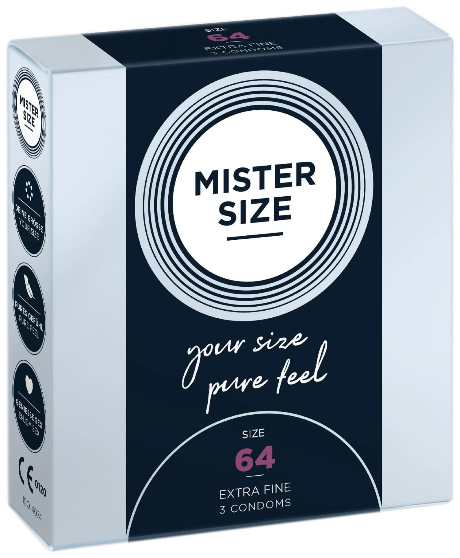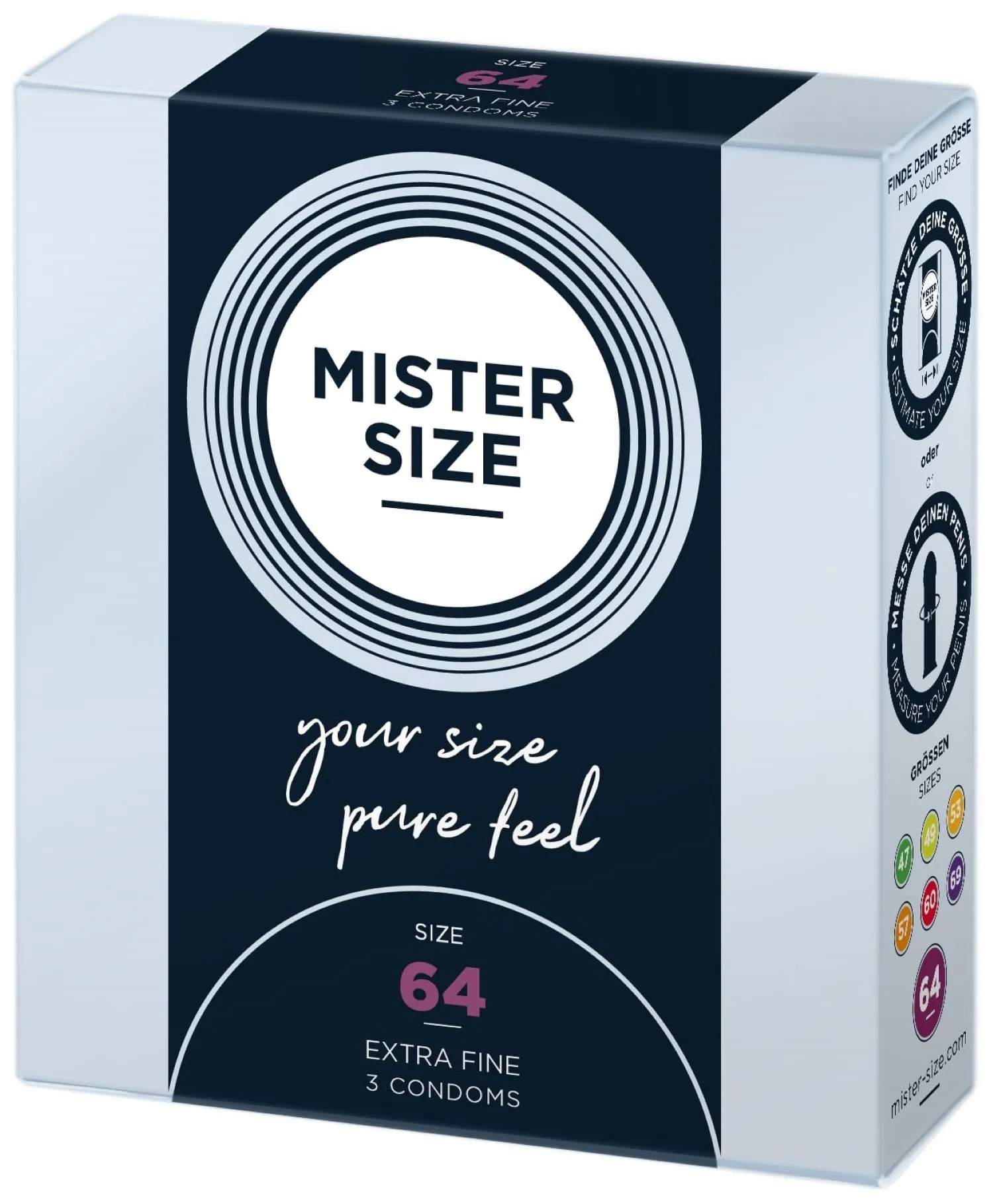 Los preservativos de la marca alemana Mister Size tienen tamaños diferentes, por lo que siempre habrá alguno que se adapte perfectamente a ti. Estos preservativos de 64 mm son más anchos.