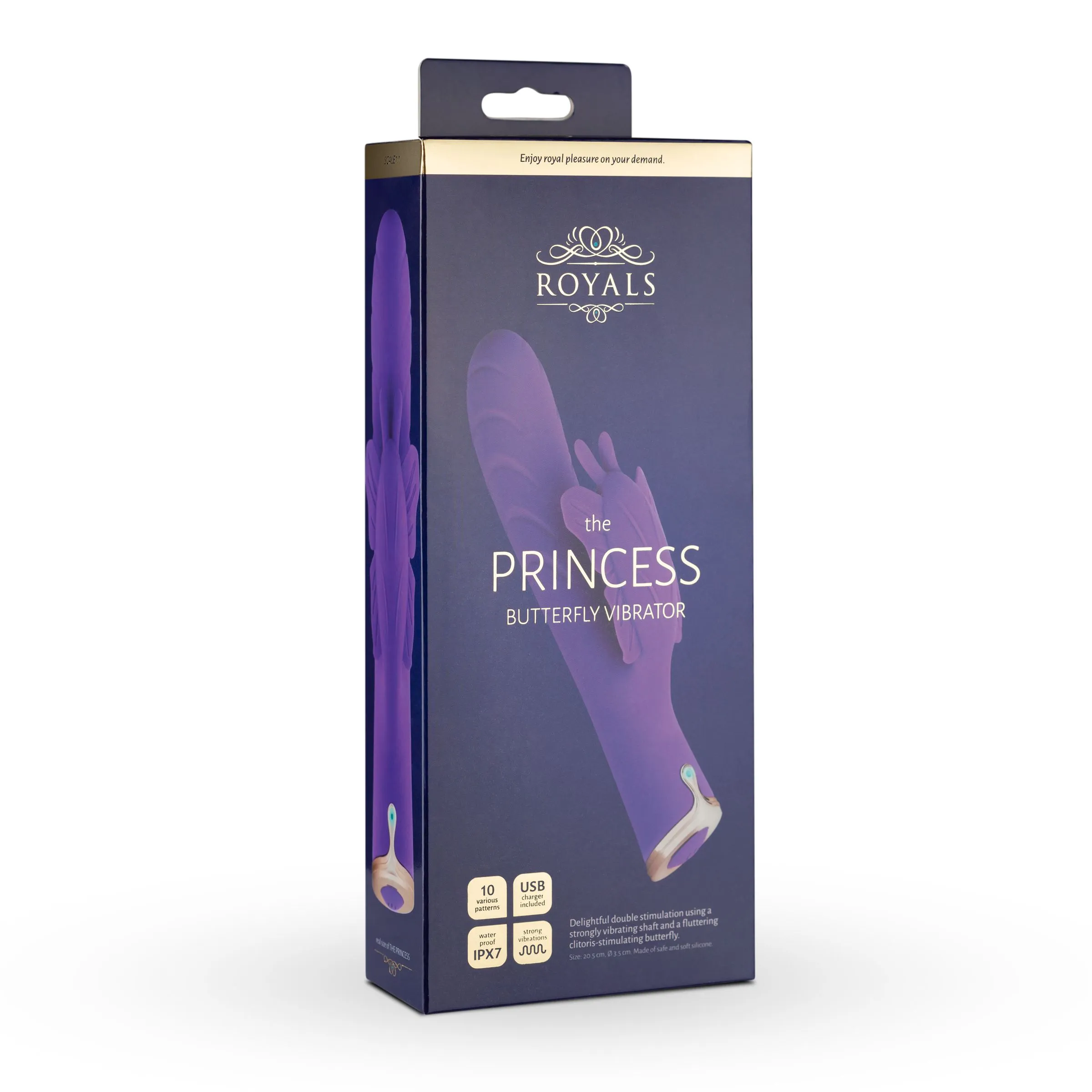 El vibrador Princess Butterfly es un vibrador de gama alta y realista con 2 motores. La punta redonda tienes crestas estimulantes, mientras que el estimulador independiente con forma de mariposa estimula el clítoris y los labios vaginales. El vibrador Princess se controla con un solo botón que sirve para desplazarse fácilmente por los 3 ajustes de vibración y 7 patrones diferentes. El material de silicona, suave como la seda, te da una sensación de comodidad. El vibrador se recarga rápidamente con el cable USB incluido. Después de usarlo, limpia siempre el juguete con agua tibia y un limpiador de juguetes.