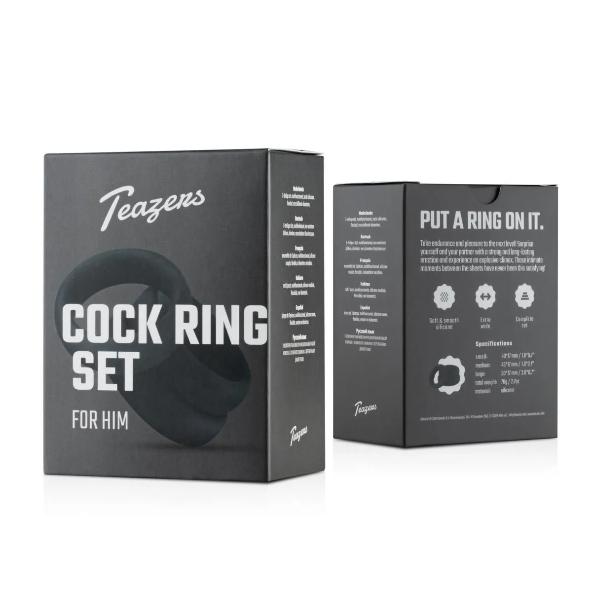 Estos anillos de silicona de la colección Teazers son varoniles y duraderos y se pueden usar de varias maneras. Los anillos para pene son extra anchos para una máxima comodidad en su uso. Póntelos con un poco de lubricante a base de agua y decide cómo quieres usar los anillos para pene. Debido a que el conjunto consta de varios tamaños, puede estar seguro de que siempre hay un tamaño adecuado para usted. Limpie el anillo después usarlo con agua y limpiador para juguetes.