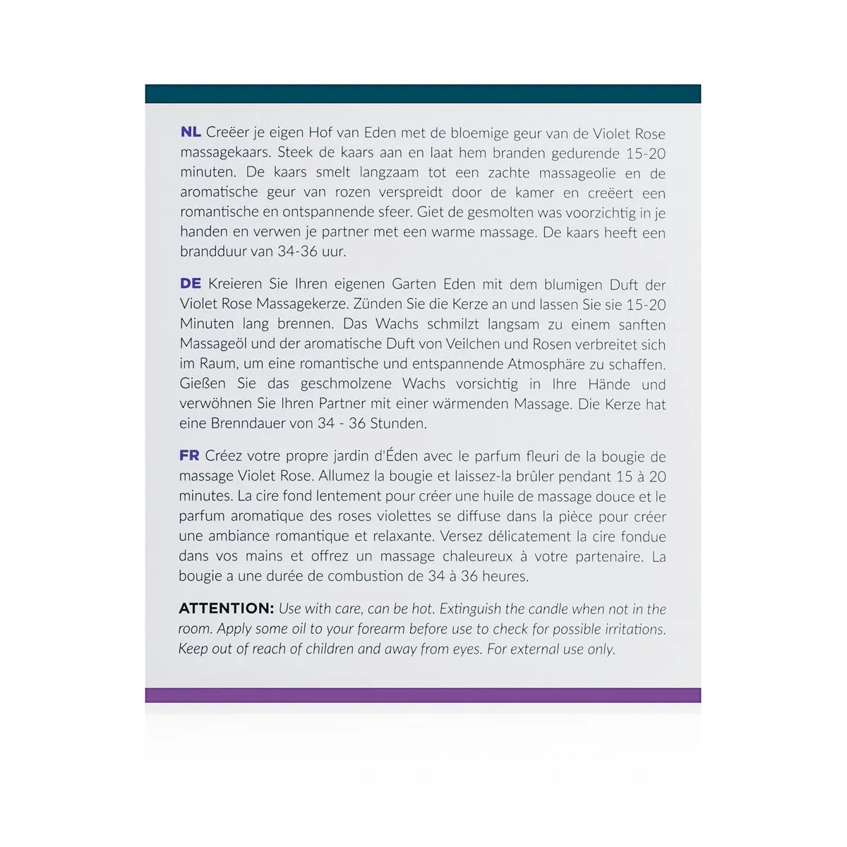 Disfruta o da un masaje encantador con esta vela de masaje Exotiq. Encienda la vela y disfrute de la maravillosa fragancia de rosa violeta que se extiende por la habitación.